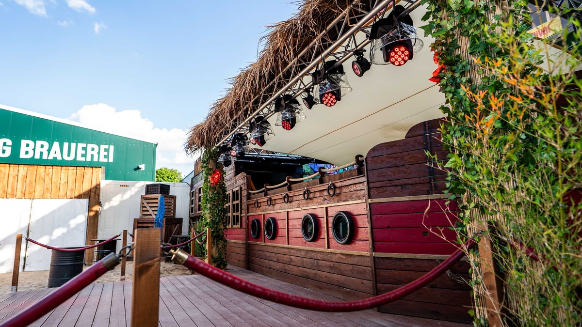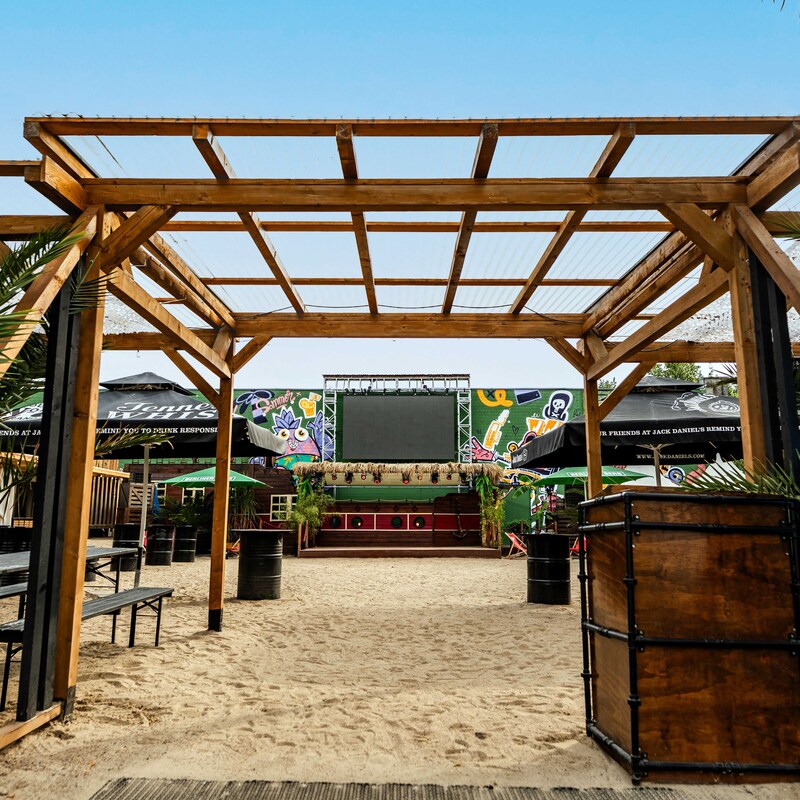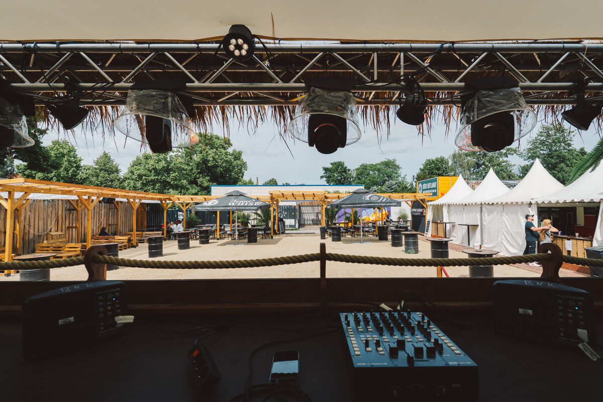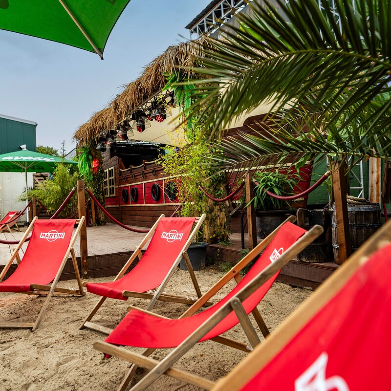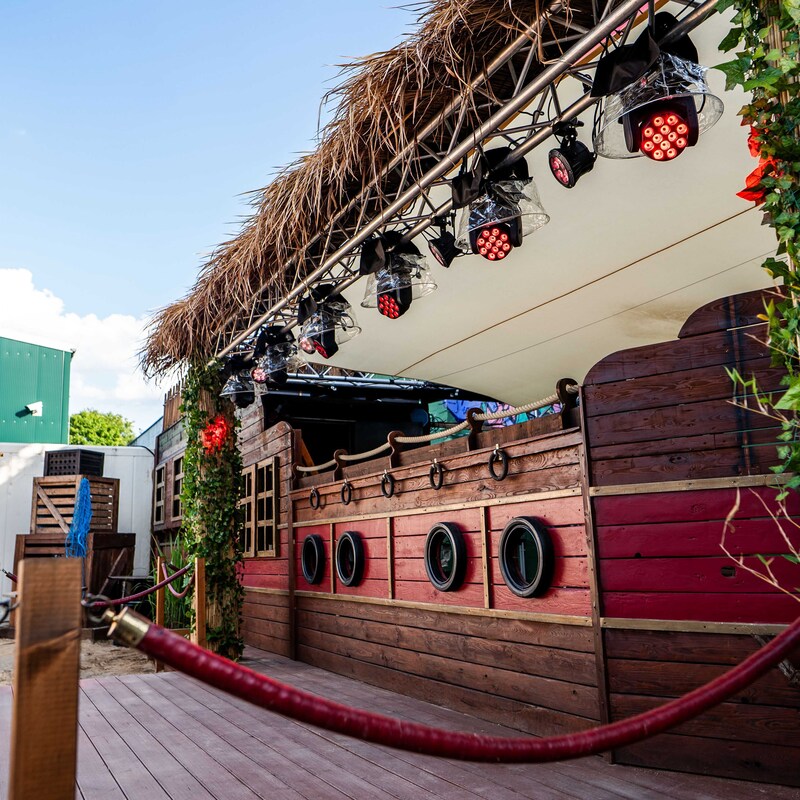 Daten: Gesamtfläche 700 m² | Strandbereich 350 m² | Bühne & Unique DJ Booth im Boot Design | eingebaute Ton- und Lichtanlage | 12m² LED Screen | moderne Food&Beverage Pagoden | Stromanschlüsse 1 x 32A CEE & 1x 16 A CEE I | Backstage 16m² Pagode