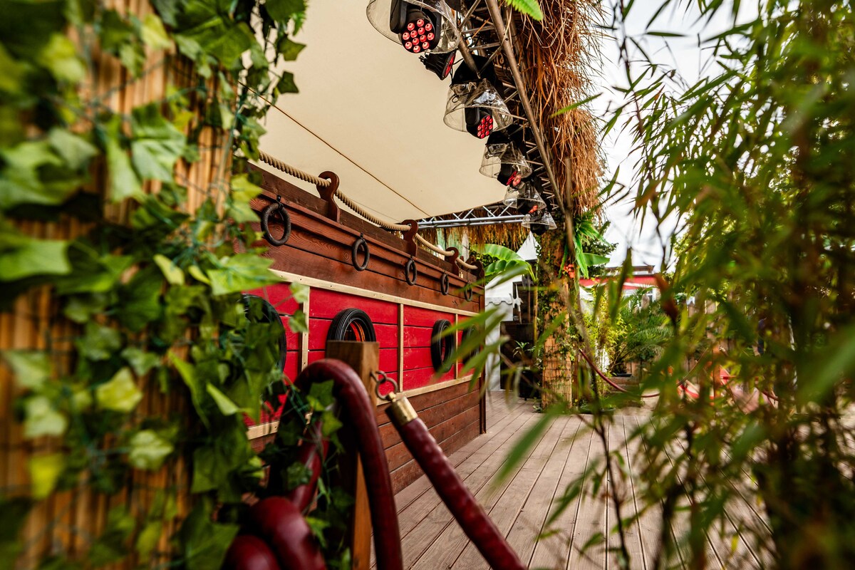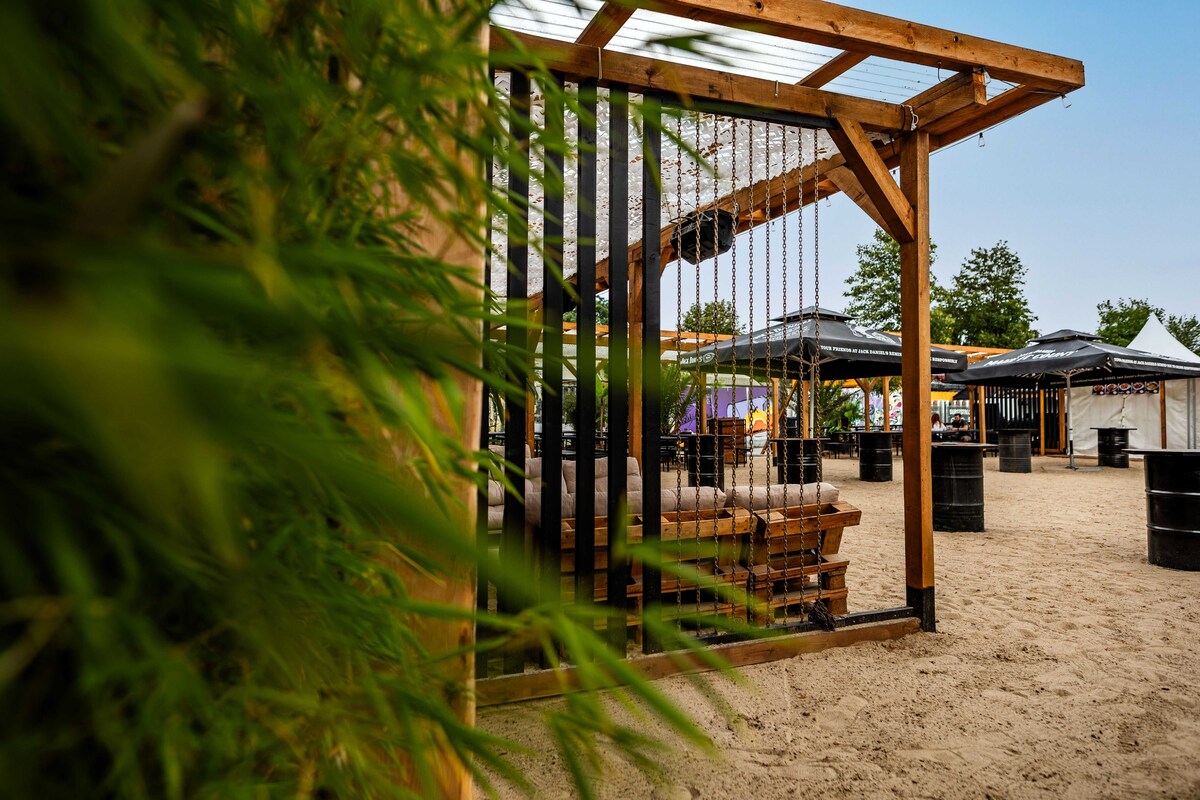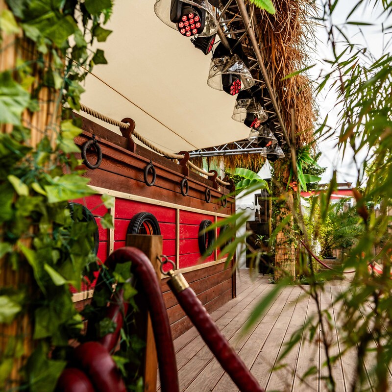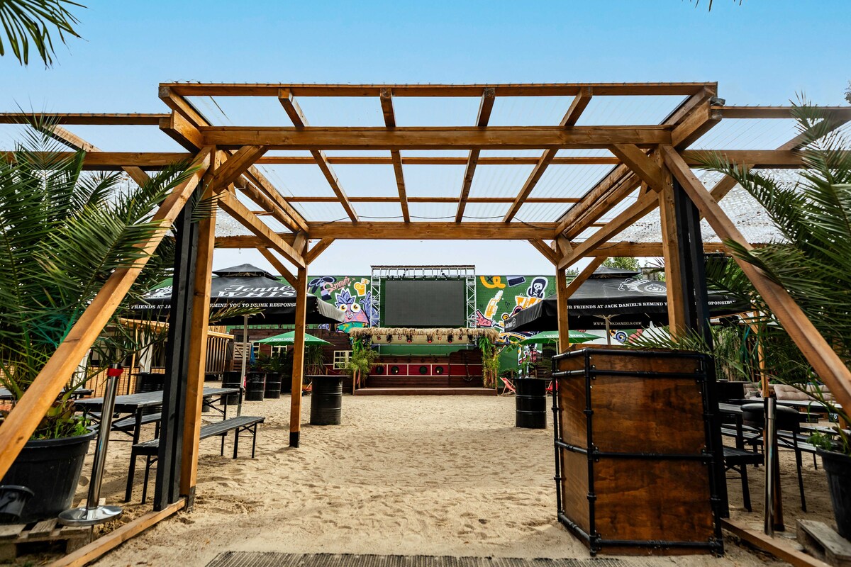 Daten: Gesamtfläche 700 m² | Strandbereich 350 m² | Bühne & Unique DJ Booth im Boot Design | eingebaute Ton- und Lichtanlage | 12m² LED Screen | moderne Food&Beverage Pagoden | Stromanschlüsse 1 x 32A CEE & 1x 16 A CEE I | Backstage 16m² Pagode